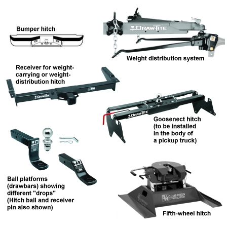 Essentially, there are five different hitch types: 1) bumper hitch; 2) weight-carrying hitch; 3) weight-distribution hitch; 4) gooseneck hitch; and 5) fifth-wheel hitch.